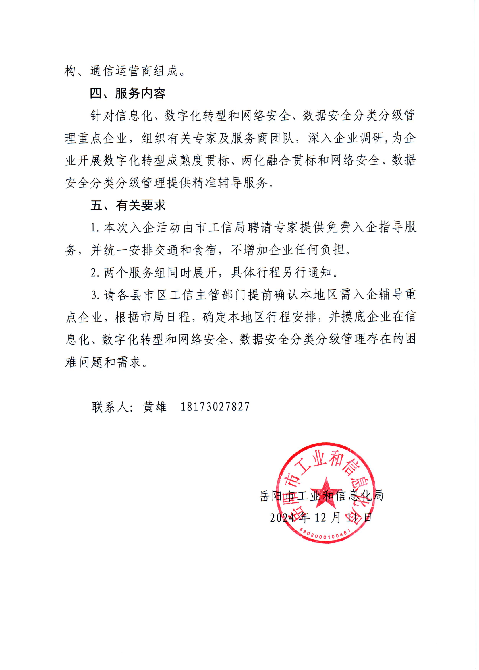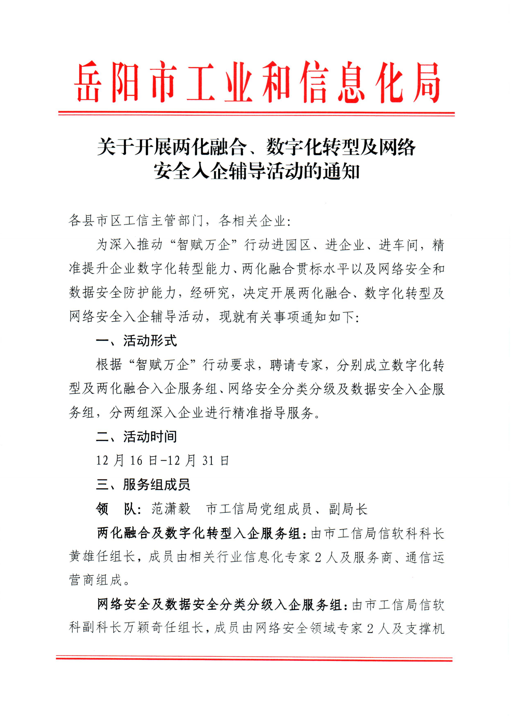為深入推動“智賦萬企”行動進園區(qū)、進企業(yè)、進車間,精準提升企業(yè)數(shù)字化轉(zhuǎn)型能力、兩化融合貫標水平以及網(wǎng)絡安全和數(shù)據(jù)安全防護能力,岳陽市工信局經(jīng)研究,決定開展兩化融合、數(shù)字化轉(zhuǎn)型及網(wǎng)絡安全入企輔導活動。
