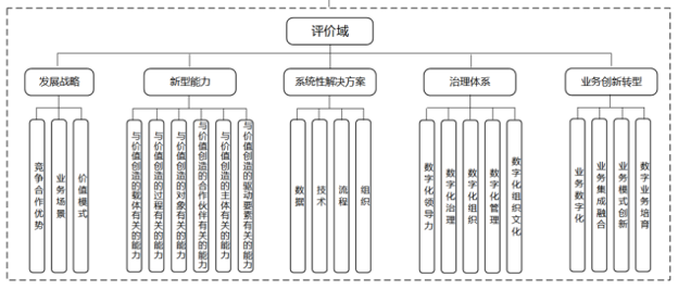 數(shù)字化轉(zhuǎn)型成熟度模型由成熟度等級、成熟度水平檔次和評價域構(gòu)成,見下圖